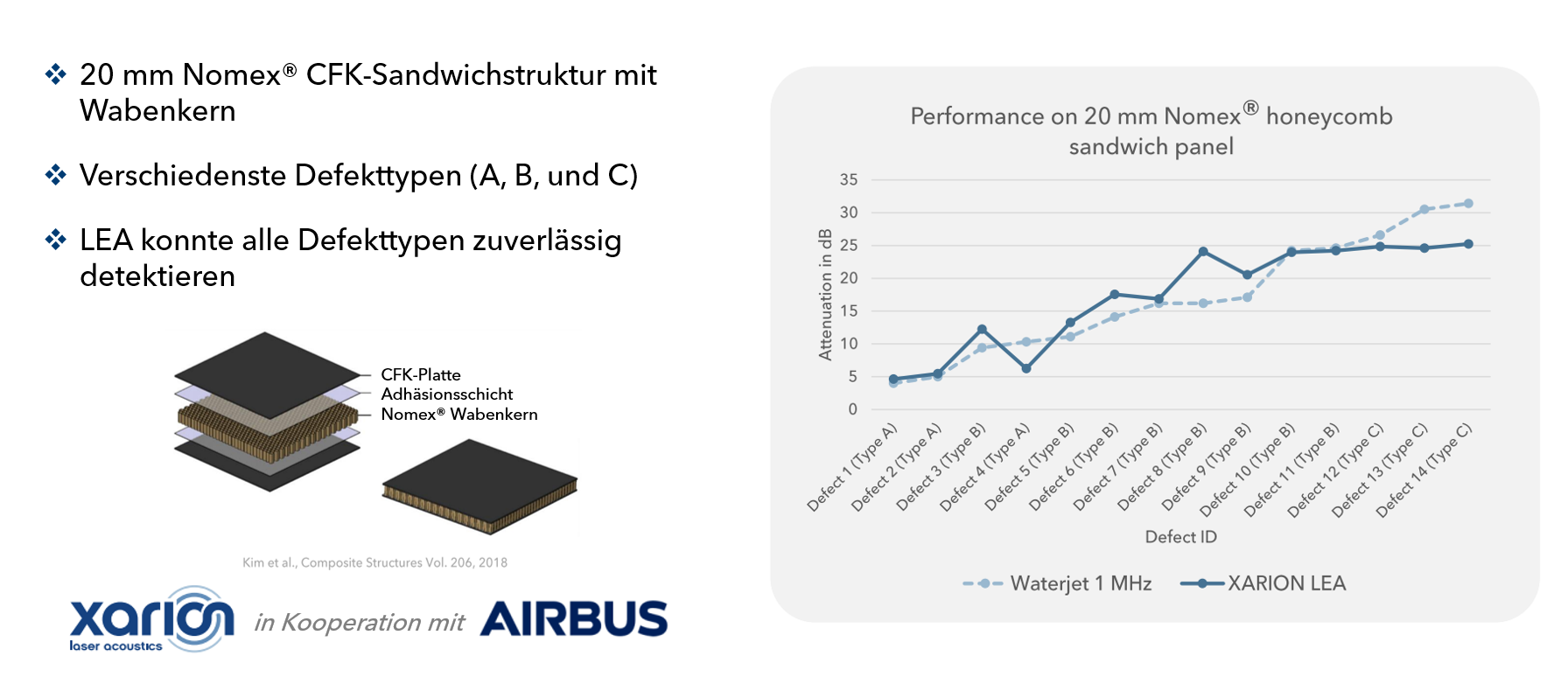 LEA stellt seine Wettbewerbsfähigkeit gegenüber kontaktbasierten Verfahren (1 MHz Wasserstrahl-UT) auf einer von Airbus bereitgestellten CFK-Sandwichstruktur mit Wabenkern unter Beweis.
