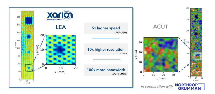 The comparison between XARION's LEA technology and the piezoelectric ACUT method clearly highlights the advantages of LEA. The images of the CFRP honeycomb structure provided by Northrop Grumman are clear.