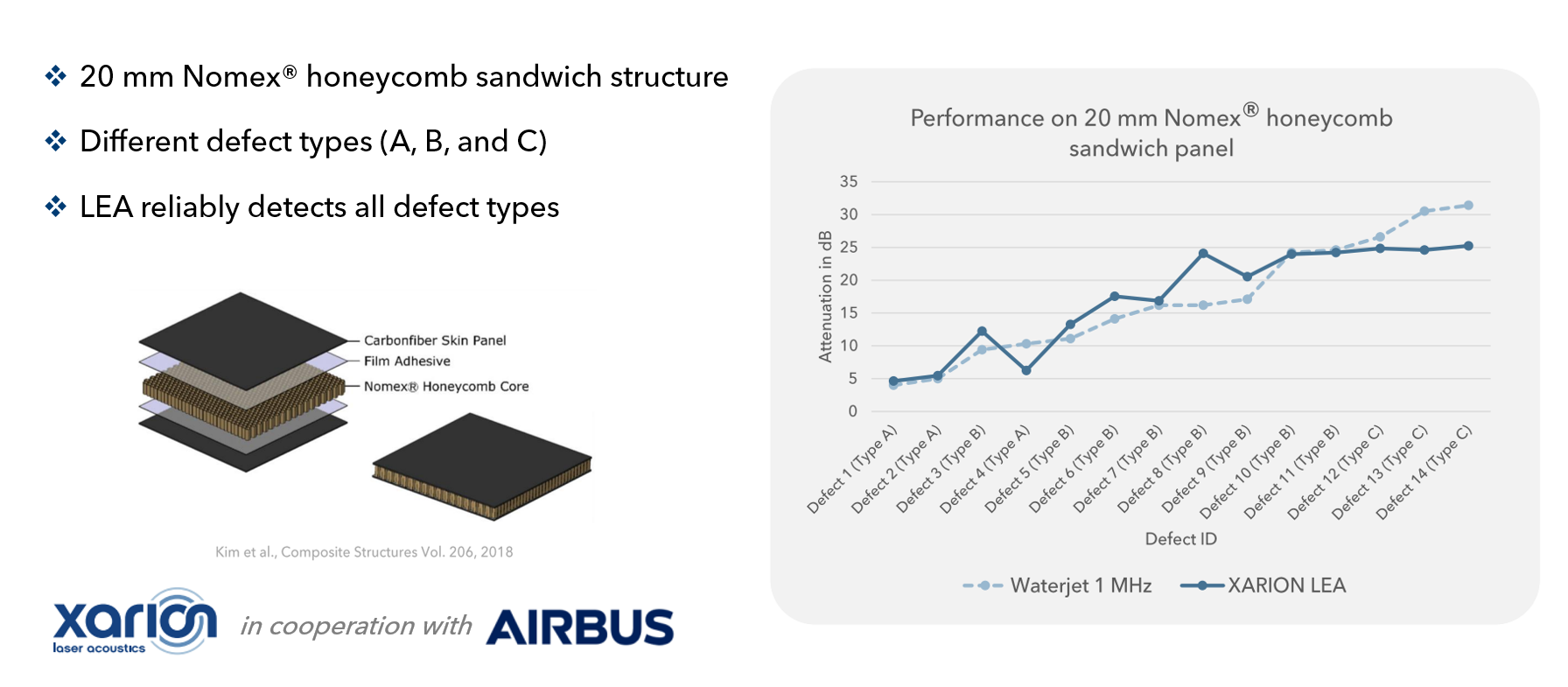 LEA proves its competitive advantage against contact-based methods (1 MHz waterjet UT) on a CFRP honeycomb structure, provided by Airbus.